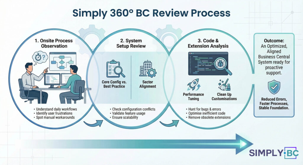 The biggest friction points in Business Central usually aren’t software bugs, they are process gaps. That is why our onboarding starts with the Simply 360° BC Review.